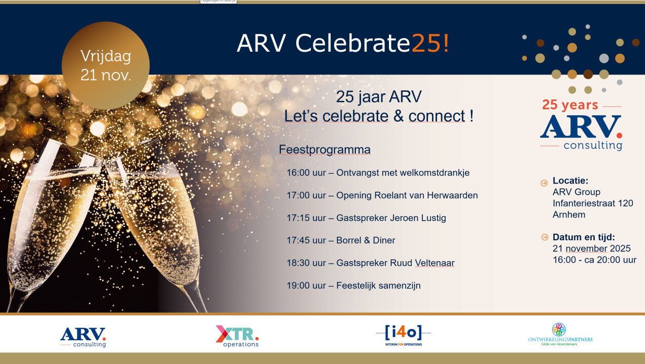 In 2025 bestaat ARV 25 jaar – een mijlpaal om trots op te zijn. Al een kwart eeuw werken we met plezier en toewijding samen met onze klanten, partners en collega’s. Dat succes willen we vieren en delen!